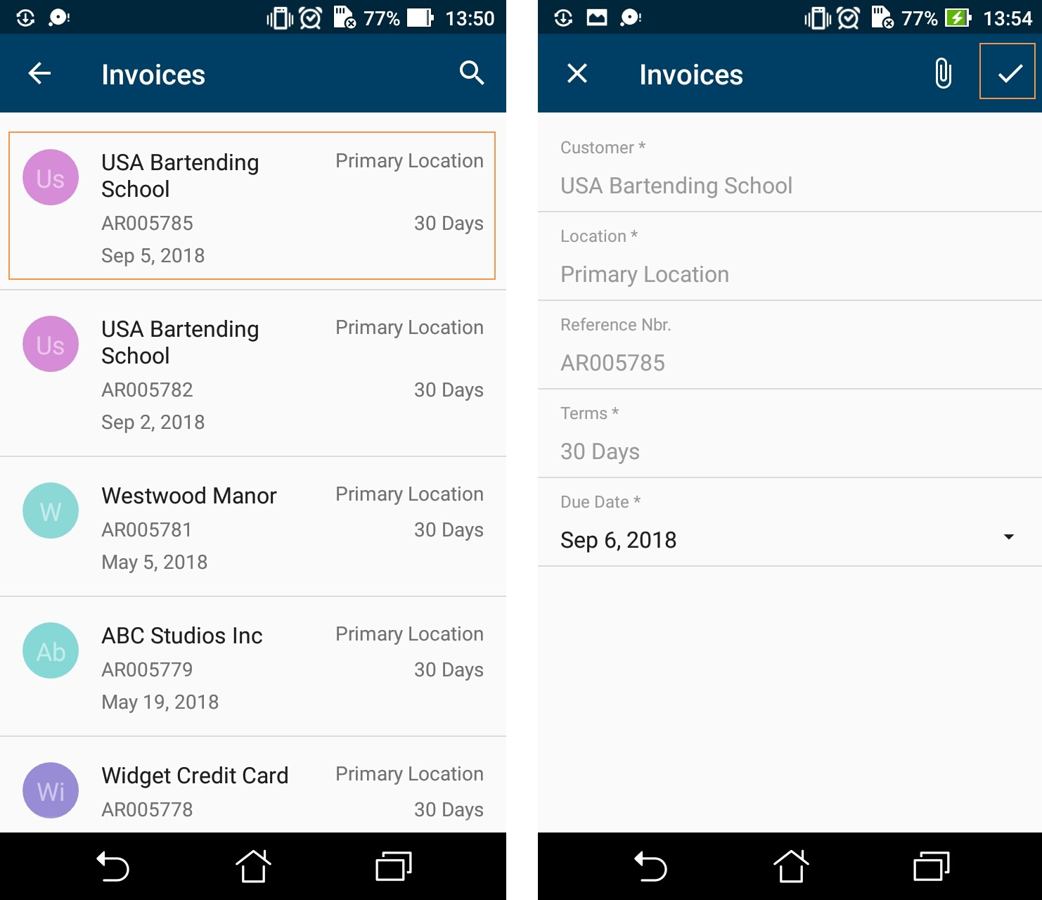 the mobile app might not be discarded on the server.The left screenshot below shows the resulting screen you will see in the mobile application; you can tap any record to make changes to it. The right screenshot shows the form view of an individual record. Once you change any setting in this view, the ✓ symbol appears. Tap it to save your changes.