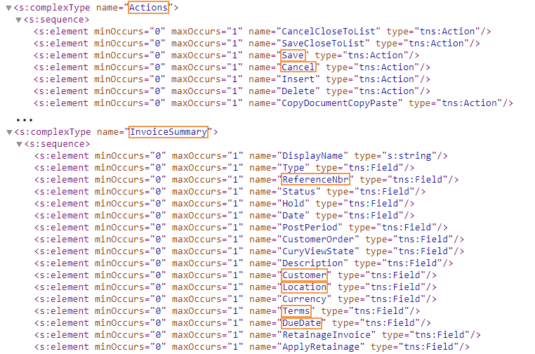Before adding a list of records created by a particular form, you explore the WSDL schema of the Invoices and Memos (AR301000) form, which the screen will be based on, as described in Getting the WSDL Schema, and find the elements you want to add to the mobile screen. In this example, we want to add an action button and several fields of a record that will be displayed in the list. The WSDL schema elements are shown below.