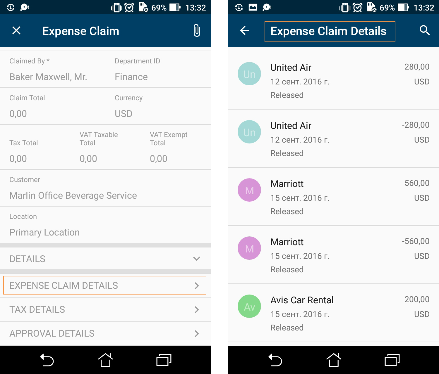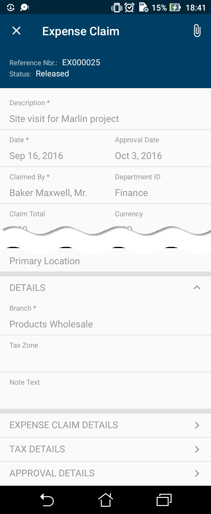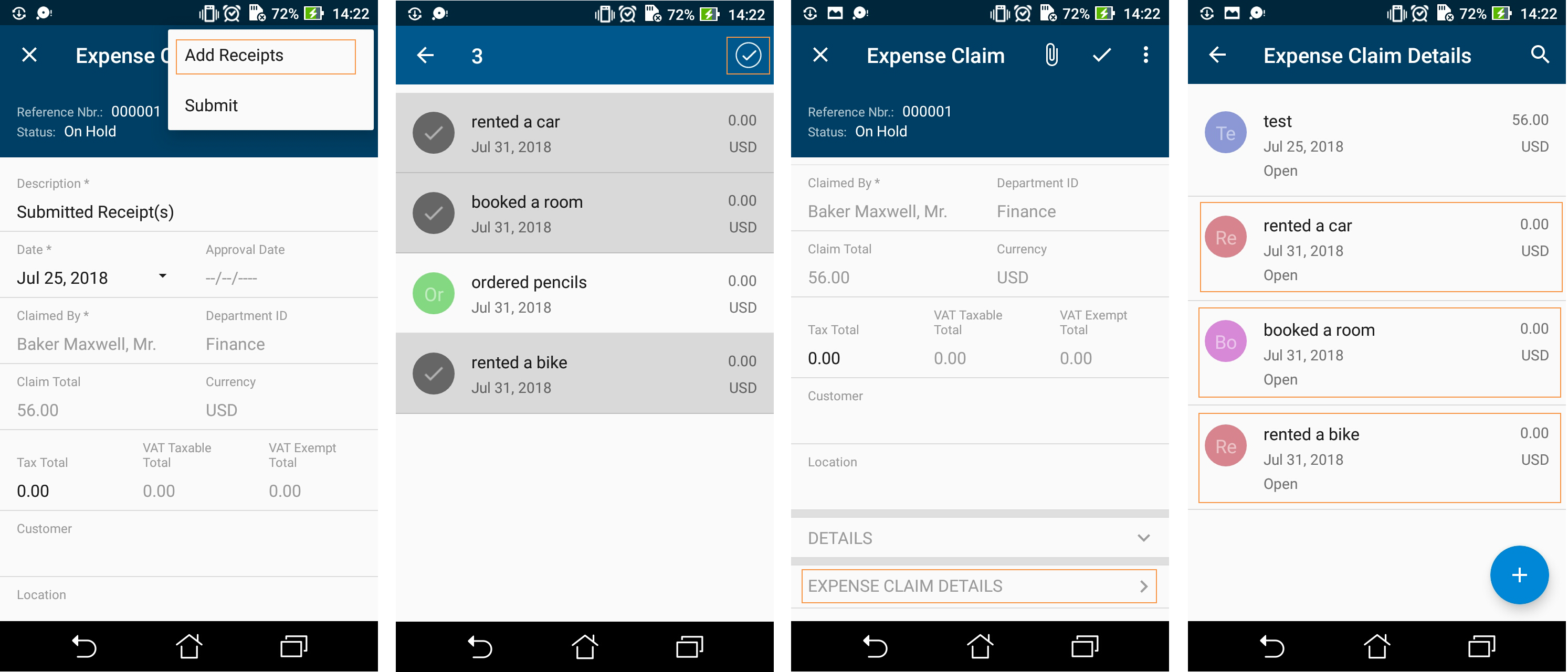 If a user taps the Add Receipts button, the mobile app displays the content of this container and provides multi-selection, as the second screenshot shows. The user can tap Expense Claim Details, as shown in the third screenshot, to view the Expense Claim Details screen, shown in the fourth screenshot.