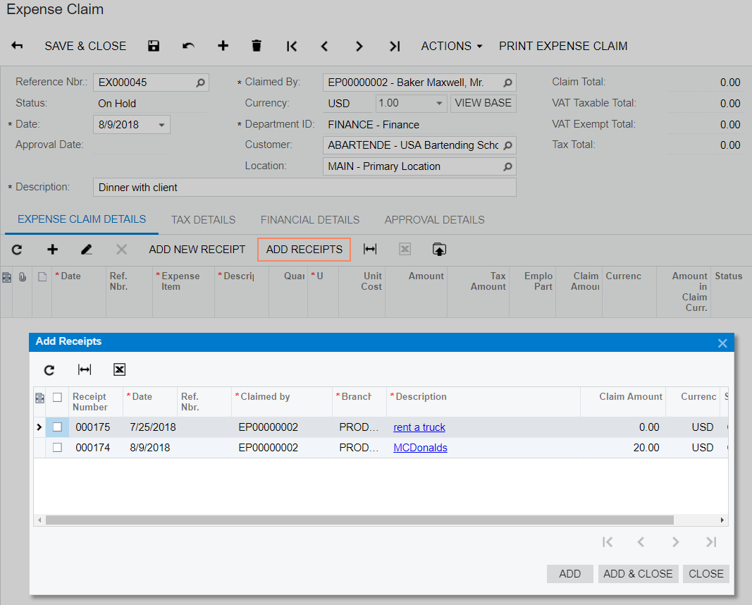 of the Expense Claims (EP301030) screen and the Add Receipts button,