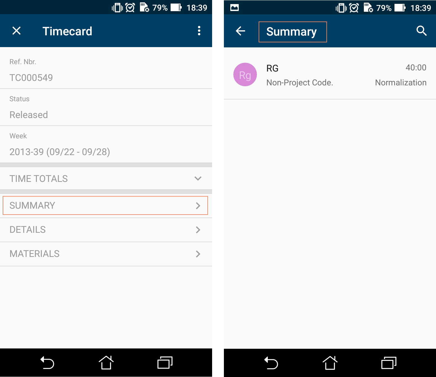 The screenshots below show the Timecard (EP305000) screen with the container links and the opened Summary screen.