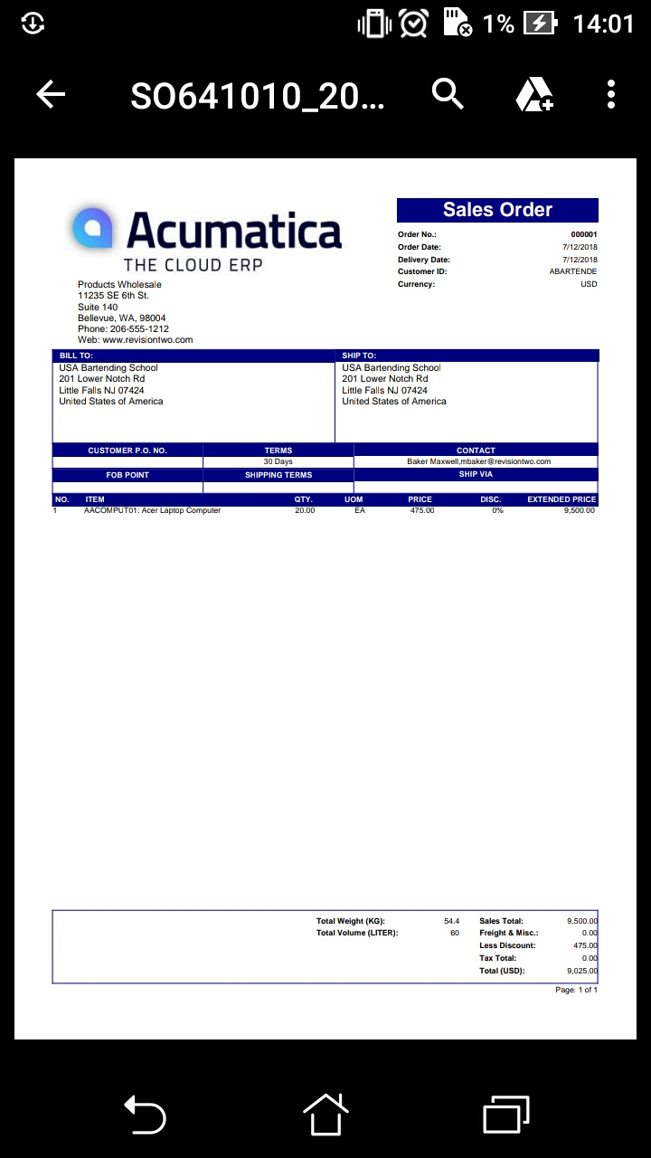 When a user performs the action by using the mobile app, the app immediately receives the corresponding report in PDF format from the MYOB Acumatica server and displays the report for the user, as shown in the following screenshot.