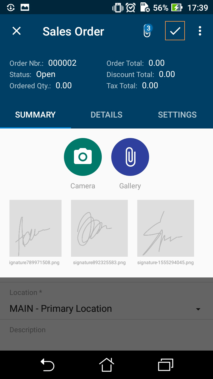 After the user clicks the Save (✓) button on the screen toolbar (shown in the following screenshot), the mobile app sends the signature file to the MYOB Acumatica server, which saves the file in the database as a file attached to the appropriate form. In the mobile app, the attachment is displayed as an image that is attached to the MYOB Acumatica form.