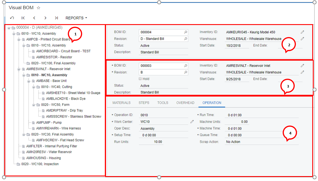 This area indicates the data for the bill of material selected in the navigation area.