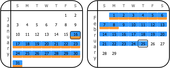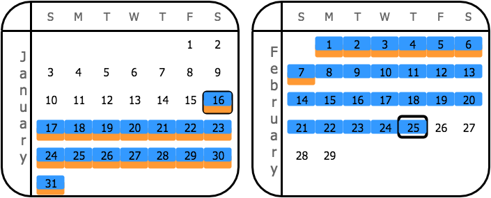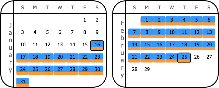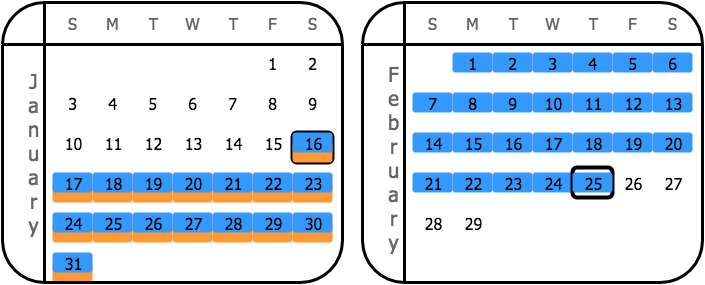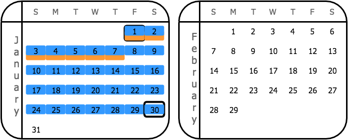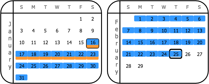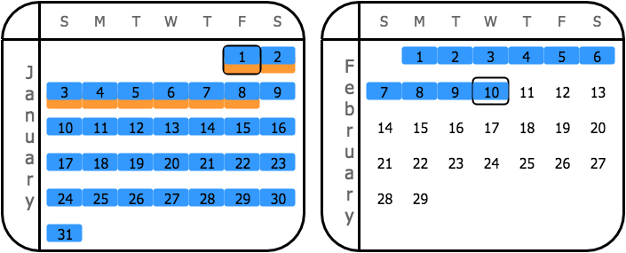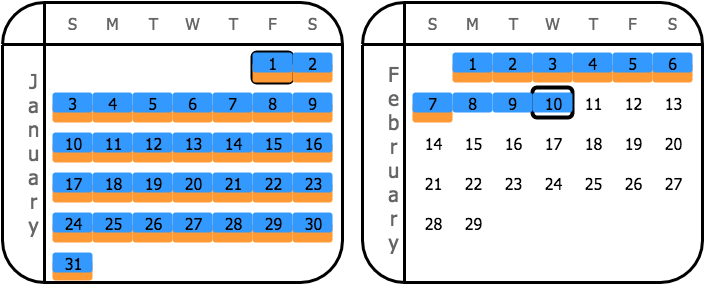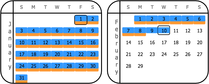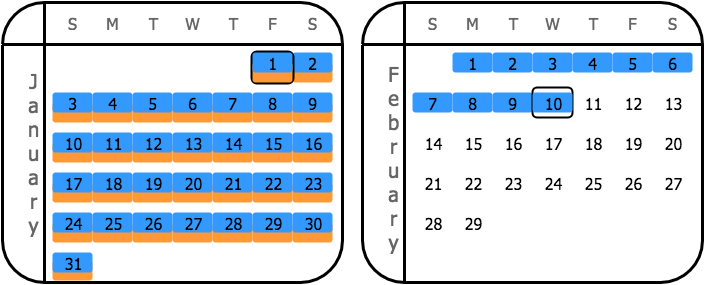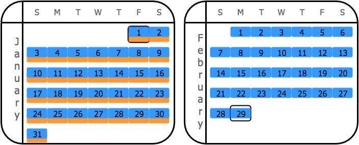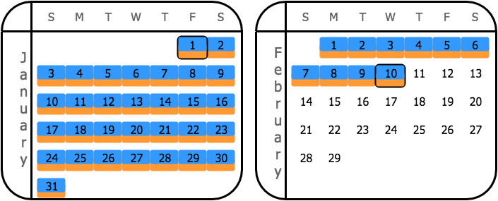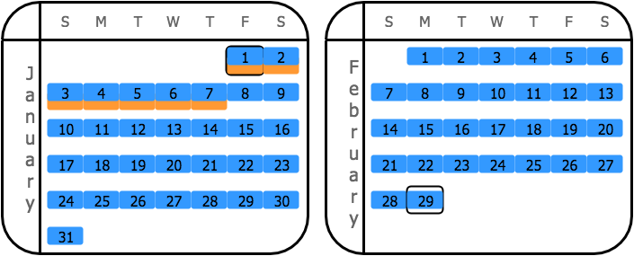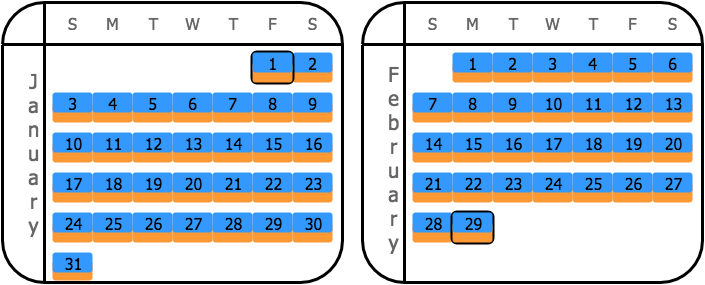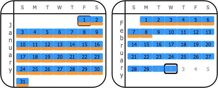 In this example, the value of the Due Day 1 parameter is greater than the number of days in the next month (February); therefore, the system uses the last date in the next month for the calculation of the credit period.