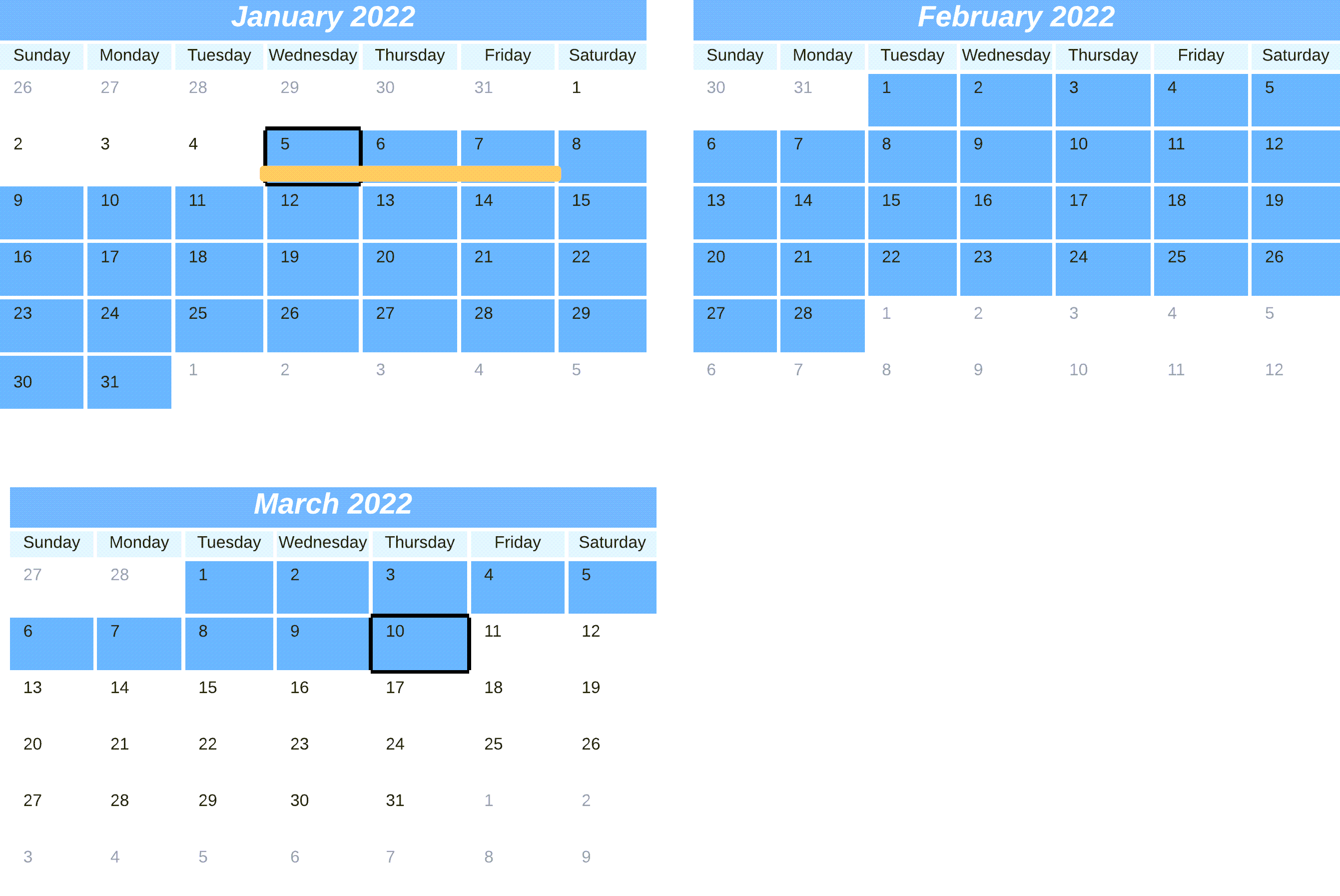 Credit period: 1/5/2022–3/10/2022 Cash discount period: 1/5/2022–1/7/2022 ![]() |