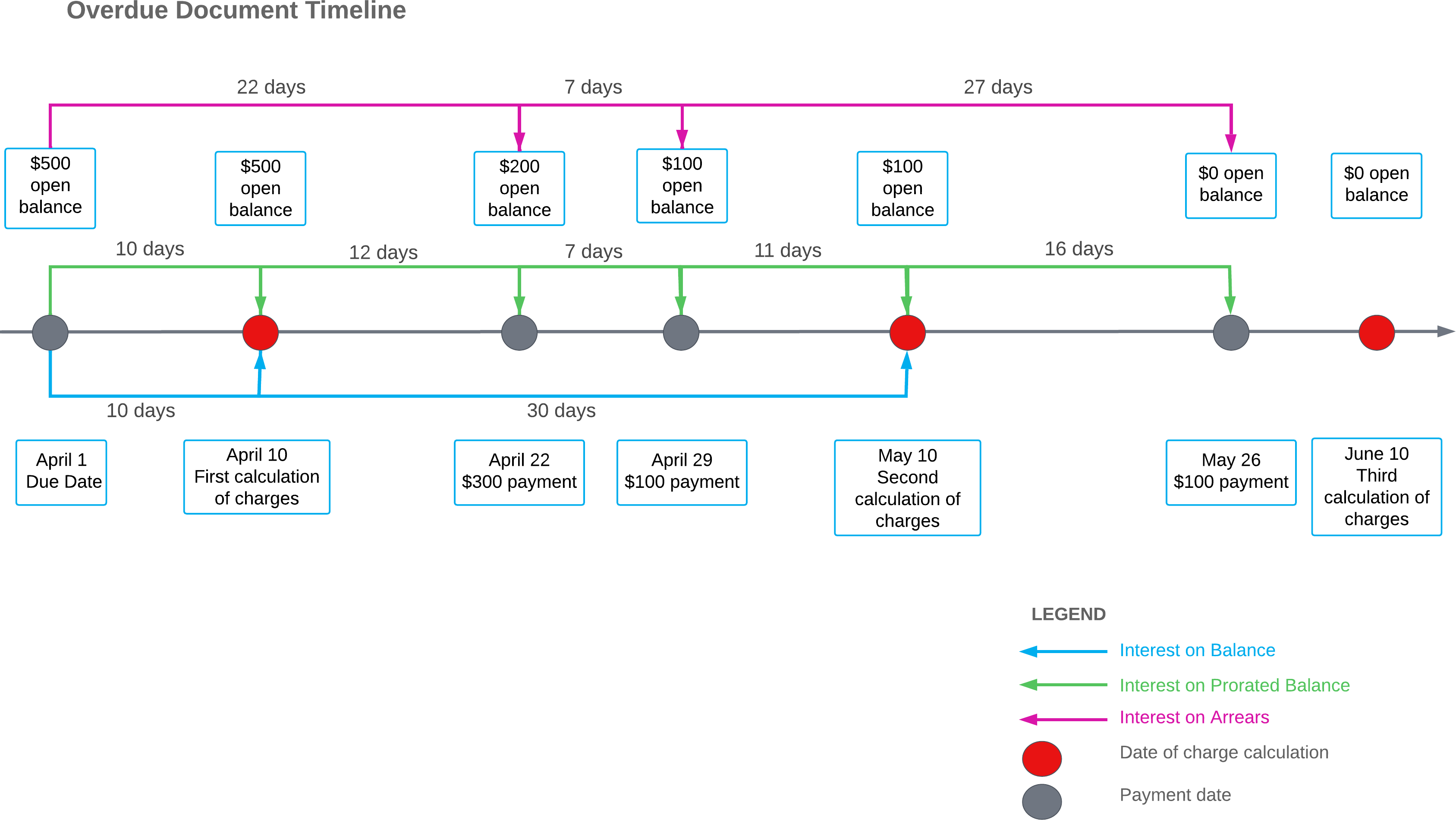 - On the second calculation of overdue charges, the system applies the sum of charges to the $500 open balance for 12 days overdue, to the $200 open balance for 7 days overdue, and to the $100 open balance for 11 days overdue; it then creates an overdue charge document in the amount of (0.1 * 12 * $500 / 365) + (0.1 * 7 * $200 / 365) + (0.1 * 11 * $100 / 365) = $1.64 + $0.38 + $0.3 = $2.32.