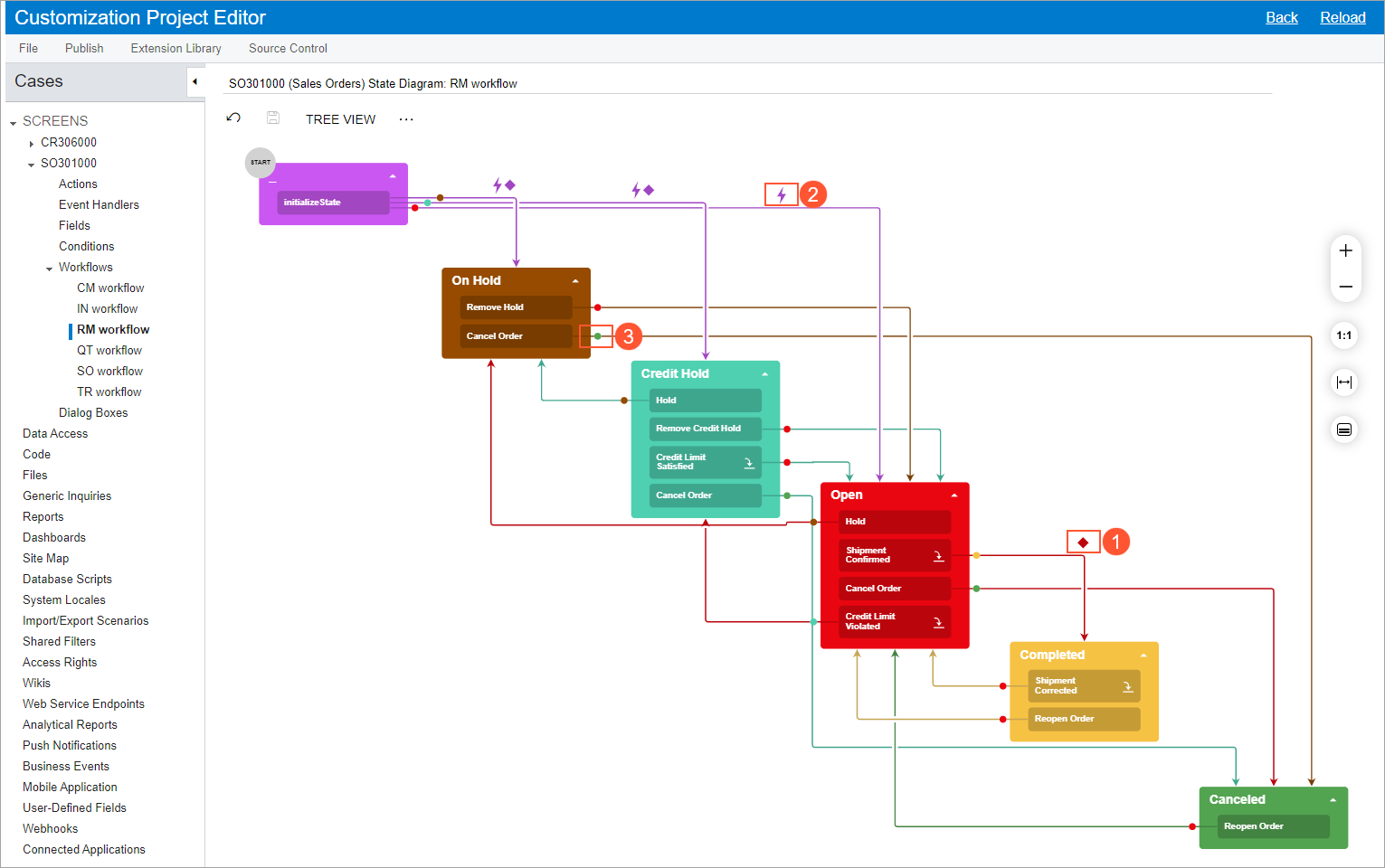 For a customized or custom workflow of a particular screen (that is, a form in MYOB Acumatica), you can use the diagram view of the Workflow page (also referred to as the Workflow Visual Editor) to define the states, transitions, and actions of a workflow. (In addition to the diagram view of the workflow, you can use the tree view of the workflow, which is described in Workflow (Tree View).) The diagram view provides visual representations of the states and the transitions between them.