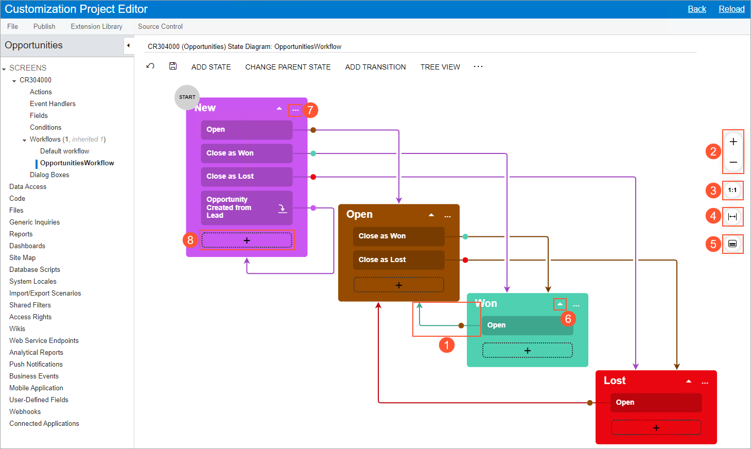 - Arrows that show the transitions between the states. For example, Item 1 in the following screenshot shows an arrow that represents a transition from the Won state to the Open state of an opportunity that has been created on the Opportunities (CR304000) form.