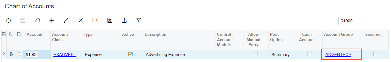 - On the table toolbar of the Accounts tab, click Add Row, and in the row, select the 61000 - Advertising Expense account.