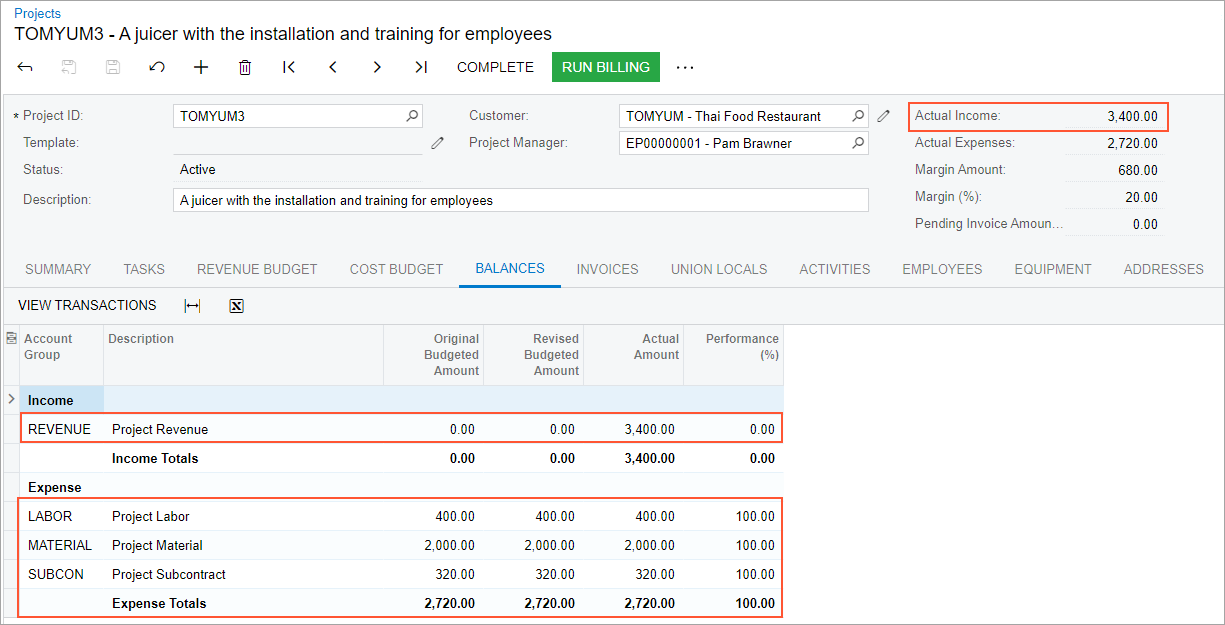 - On the Projects (PM301000) form, open the TOMYUM3 project. Notice that in the Summary area, the Actual Income box now shows $3,400, which is the total amount of the invoice that you have processed. On the Revenue Budget tab, notice that the system has automatically created two revenue budget lines (one for each project task) and filled in the Actual Amount for the rows (3,000 and 400).