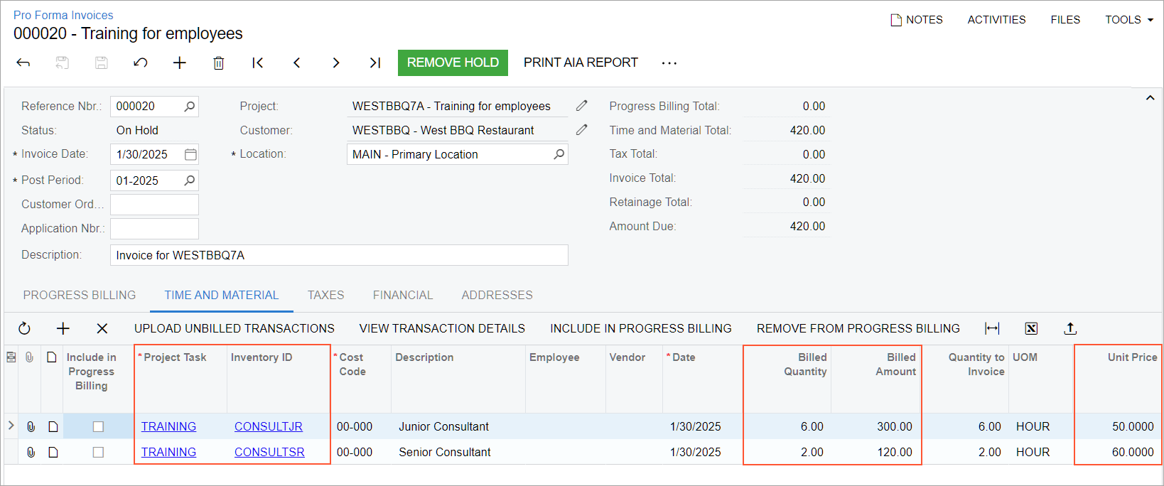 In this activity, on the Projects (PM301000) form, you will create a new project, specify a billing rule and rate table for it, and define the project tasks. Then you will bill the project and review the billed amount and quantities in the prepared pro forma invoice on the Pro Forma Invoices (PM307000) form.