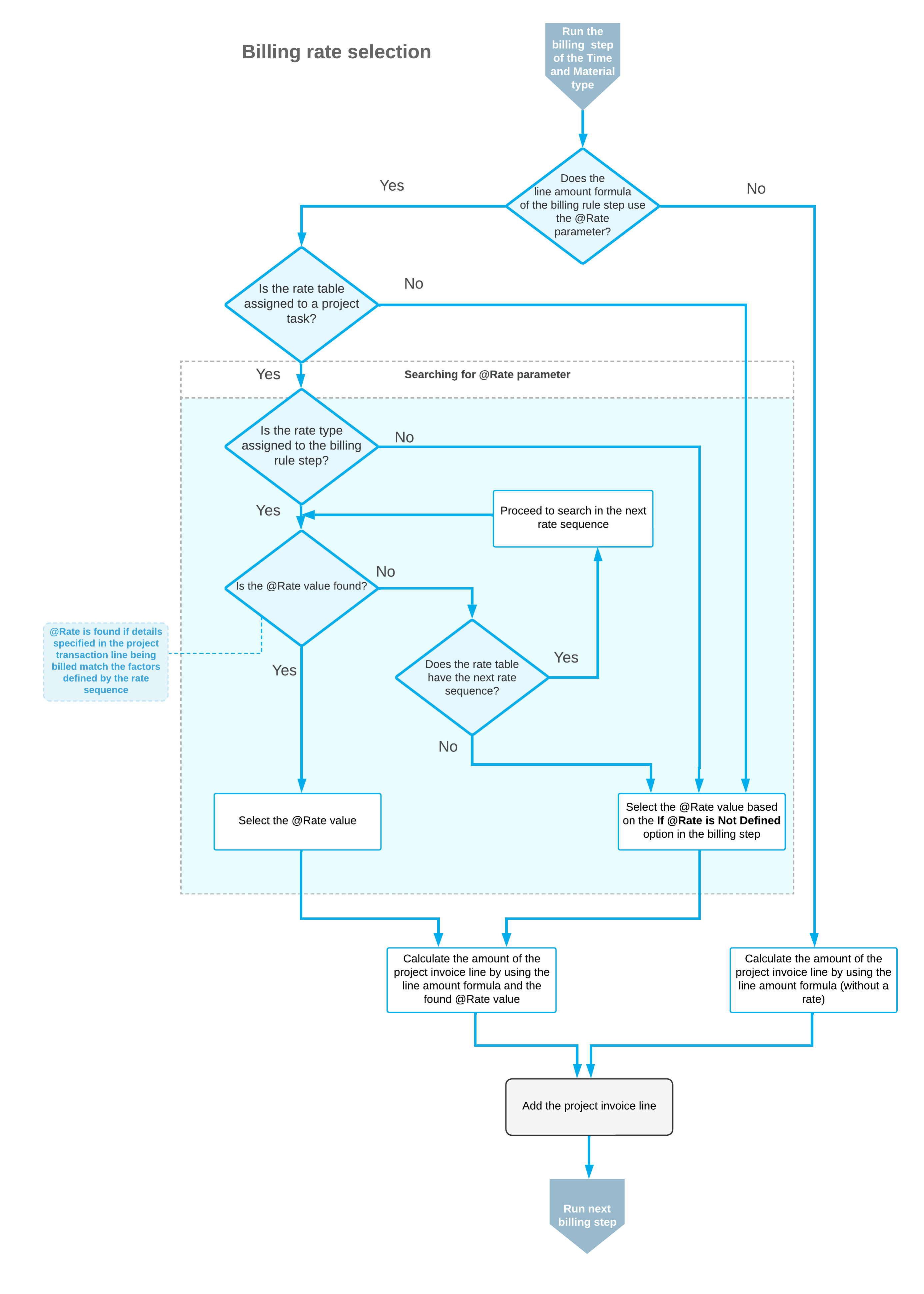 When a project transaction is billed or an allocation is run, the system finds the applicable rate—that is, the value of the @Rate parameter specified in the billing rule formula. This selection is based on the combination of the rate type assigned to the current step of a billing rule (or allocation rule) and the rate table that is assigned to the project task to which the billed or allocated transaction corresponds.