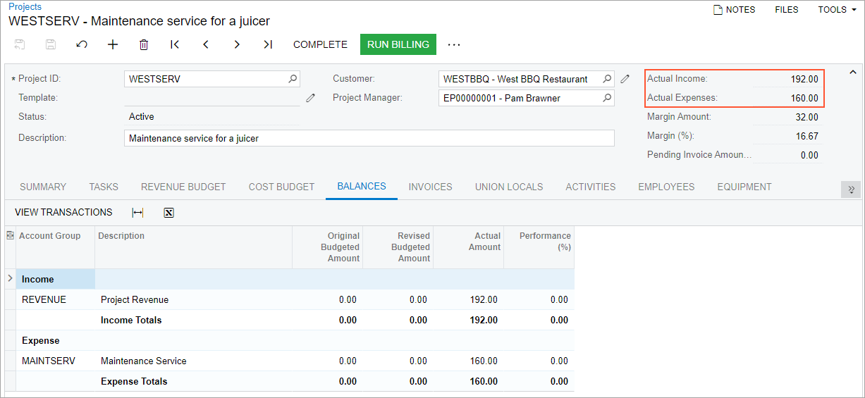 - On the Projects (PM301000) form, open the WESTSERV project, and on the Cost Budget tab, notice that a line with the cost of the provided maintenance service has appeared with an Actual Amount of $160.