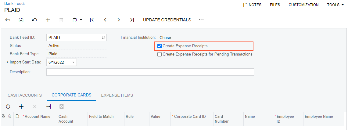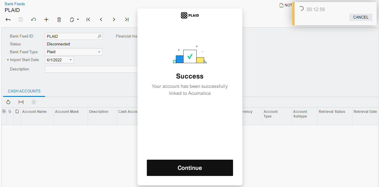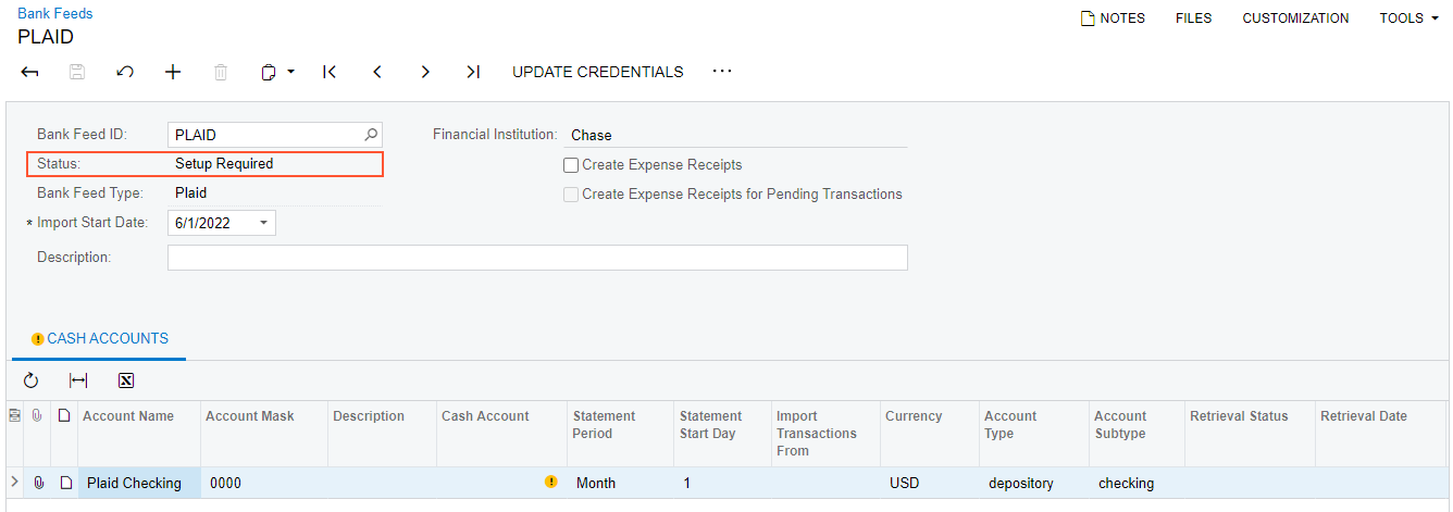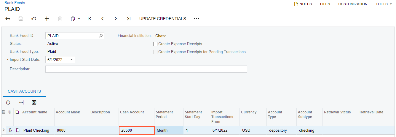 You perform the following instructions to set up the integration of MYOB Acumatica with Plaid. You use the Retrieve Bank Feed Transactions (CA507500) form as a starting point and then specify the settings of the bank feed on the Bank Feeds (CA205500) form.