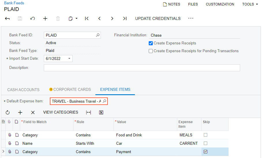 - Optional: Add a row to the table for each expense category (with Category selected in the Field to Match column), and specify the rule for matching it.