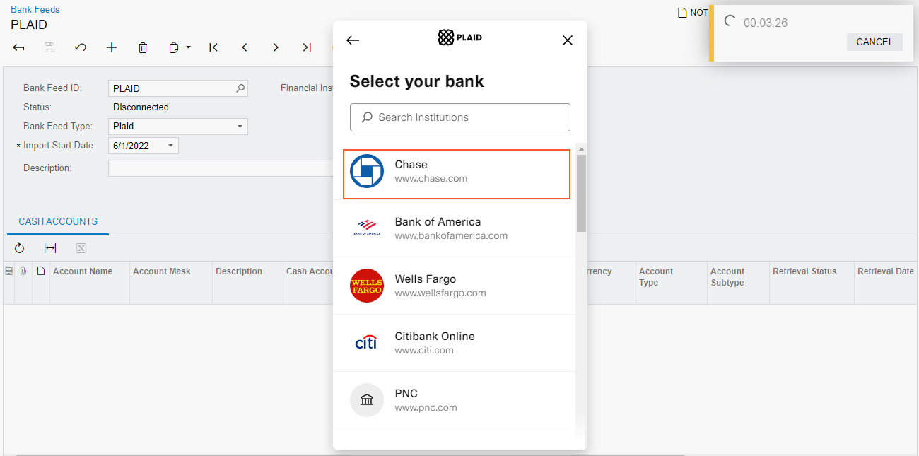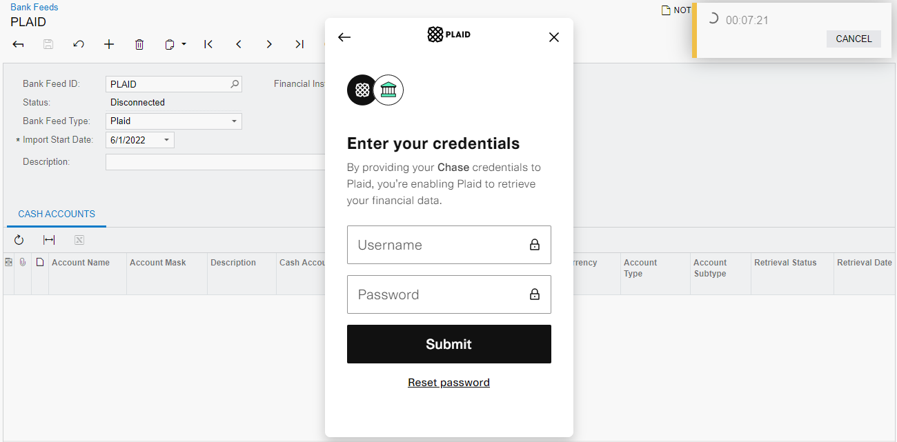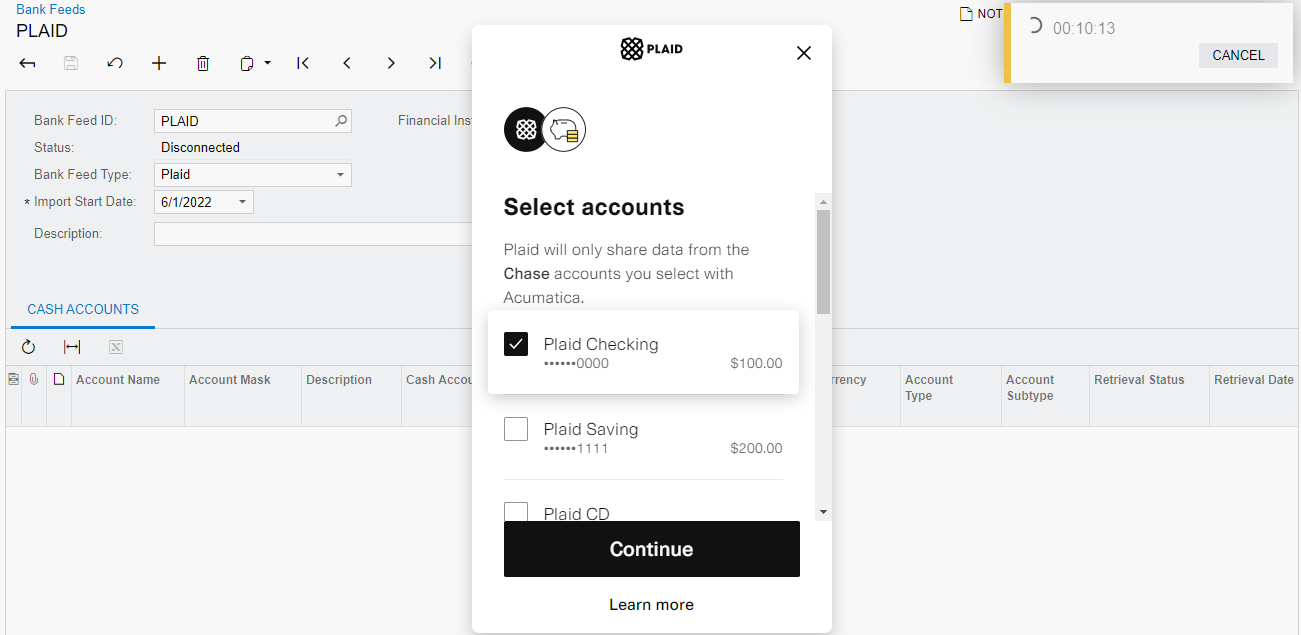 - Bank Feed Type: PlaidTip: If you want to set up a connection to the Plaid sandbox, you should select the Test Plaid type. Cash accounts mapped to bank accounts in Test Plaid bank feeds will also be counted by the license and will reduce the number of available bank feed accounts.