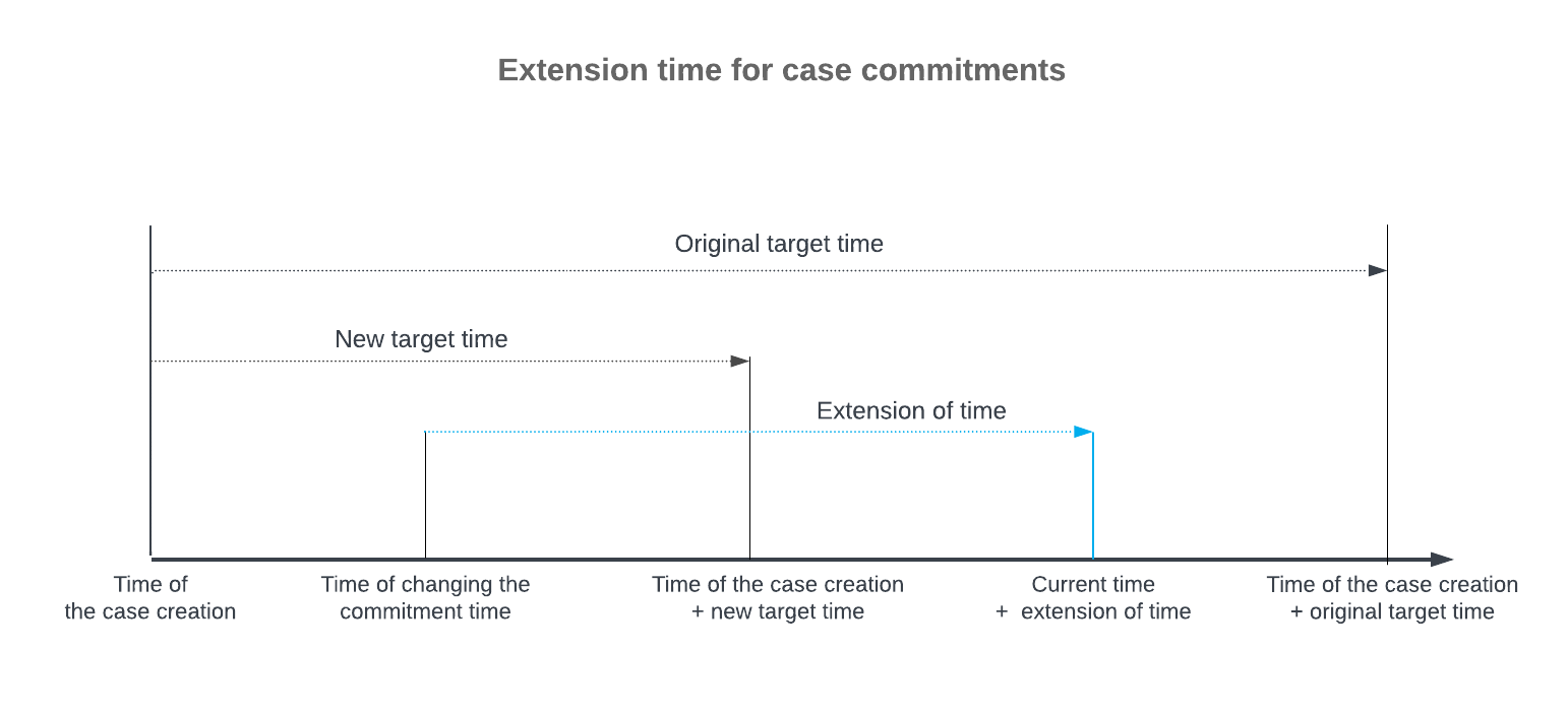 In either of these scenarios, the remaining time to fulfill the commitment (starting at the moment of the change) may be less than it would have been if the user had selected the current severity level or class at the moment of case creation. To avoid the commitment not being met for this case, the system adds the extension specified for this commitment to the current time period and sets the extended target time (for example, for resolving the case or responding to the customer), as shown in the following diagram.