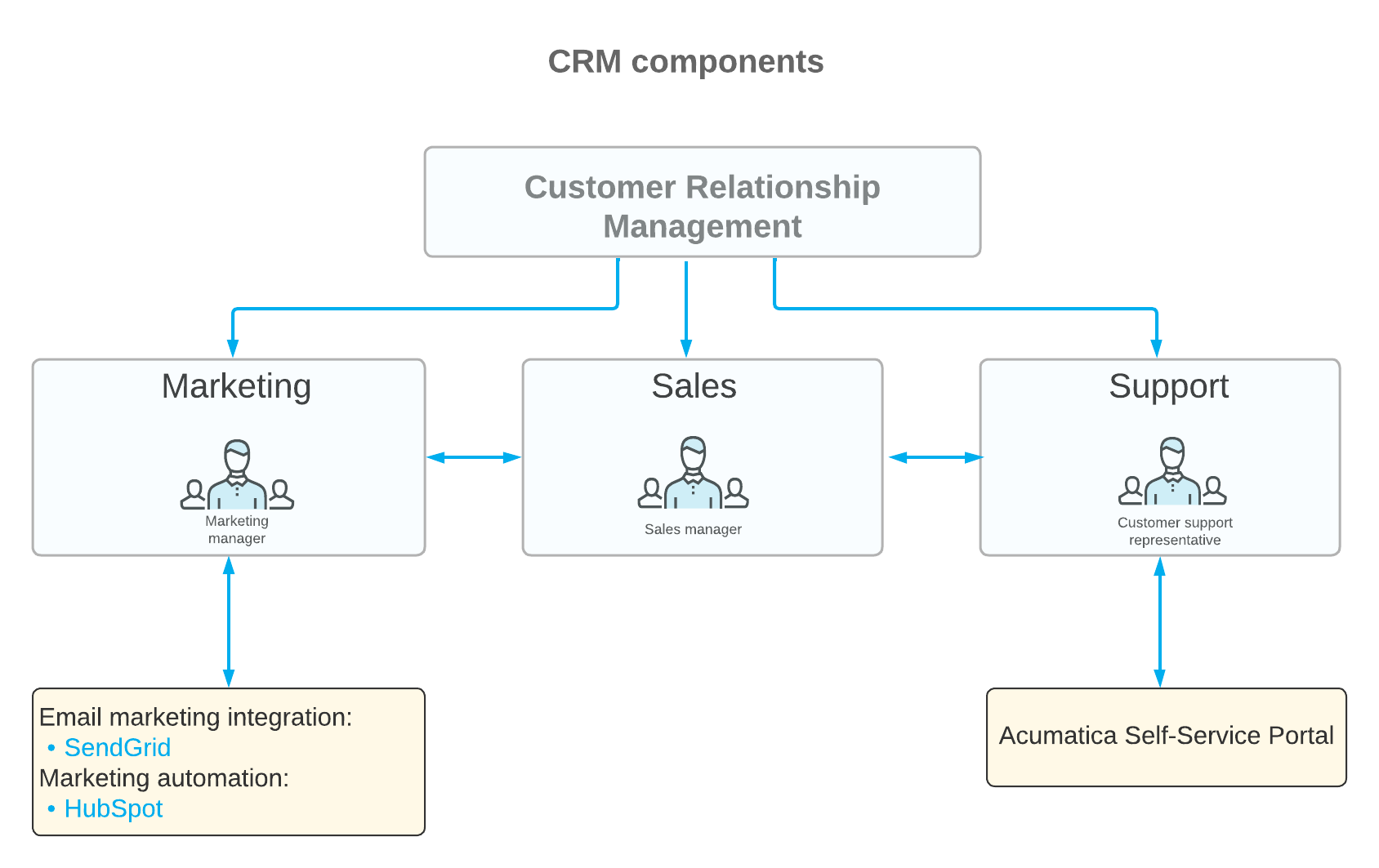 CRM consists of three major parts: marketing, sales, and support, as shown in the following diagram.