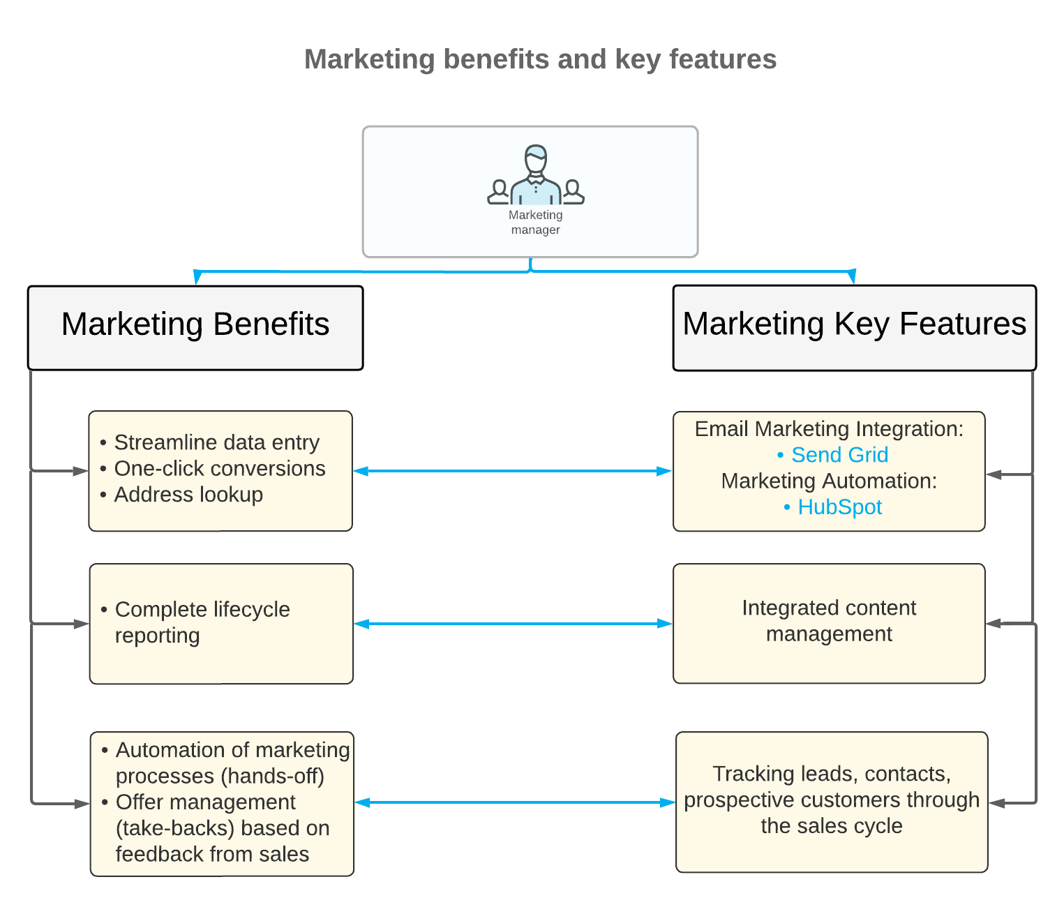 To help companies achieve these goals, MYOB Acumatica provides flexible tools for a marketing team to interact with leads and existing customers, such as the following: