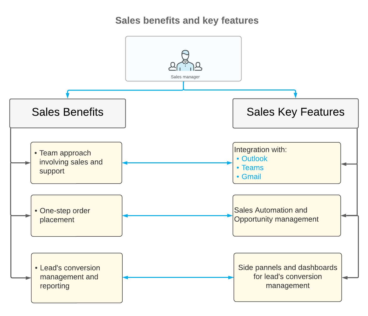 By using the MYOB Acumatica sales tools in your company's routines, your sales team can streamline its processes, enhance lead tracking, improve customer communication, and ultimately boost sales efficiency. The following diagram shows the key sales features of MYOB Acumatica.