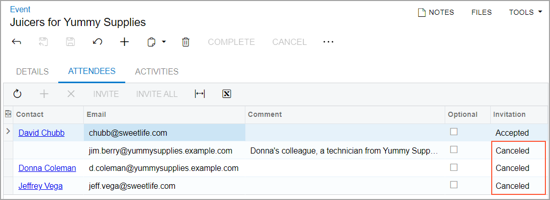 - In the Summary column, click the Juicers for Yummy Supplies link to open the event on the Event (CR306030) form. Notice that when you are viewing an event as a potential attendee, you cannot edit the settings on the Details tab.