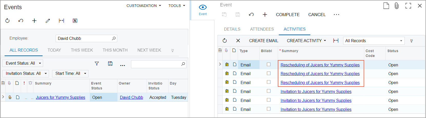 - On the All Records tab of the Events (EP4041PL) form, click the Juicers for Yummy Supplies link in the Summary column to open the event on the Event (CR306030) form.