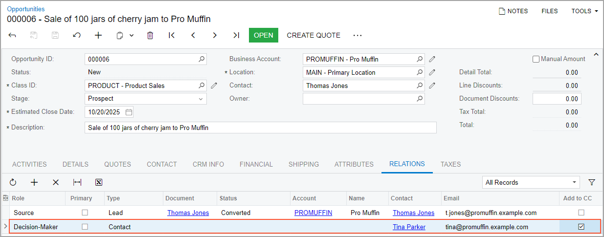 - Open the opportunity Sale of 100 jars of cherry jam to Pro Muffin on the Opportunities (CR304000) form.