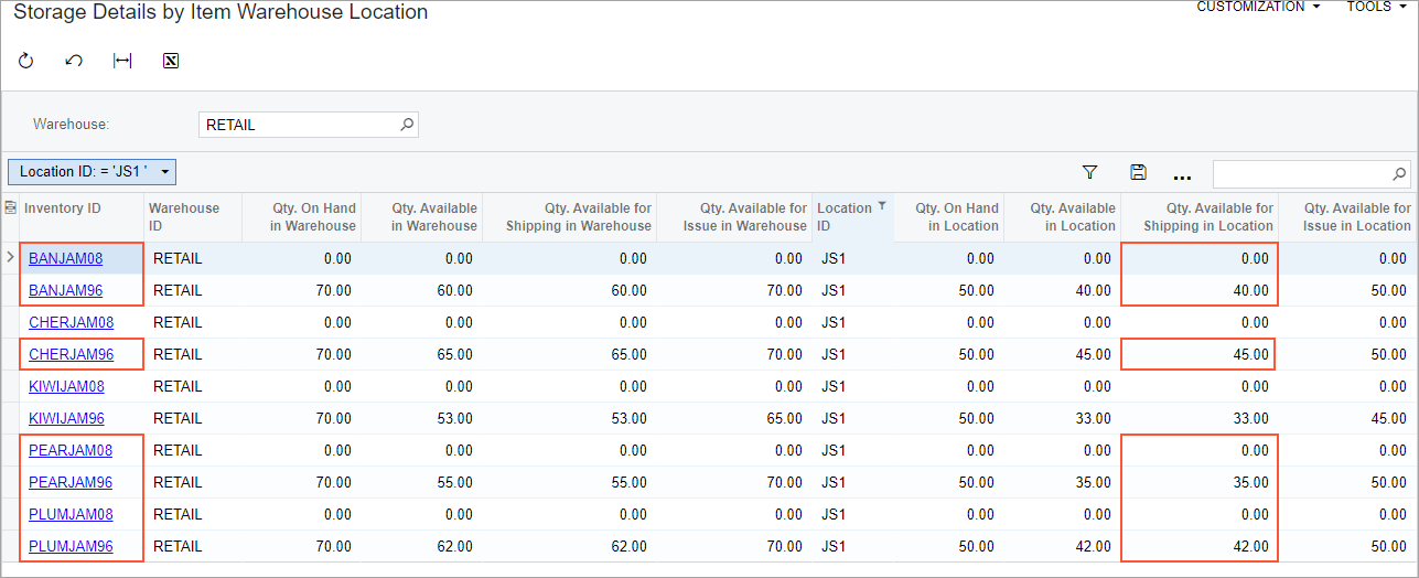 - On the Storage Details by Item Warehouse Location (IN408055) form, review the quantities of stock items available in the RETAIL warehouse.