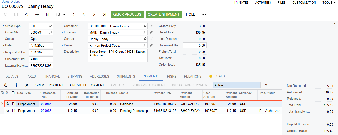 On the Payments tab, notice that two prepayments have been applied to the order: a credit card payment (mapped to the SHOPIFYPAY payment method) in the amount of $110.45 and a gift card payment (mapped to the GIFTCARDS payment method) in the amount of $25.