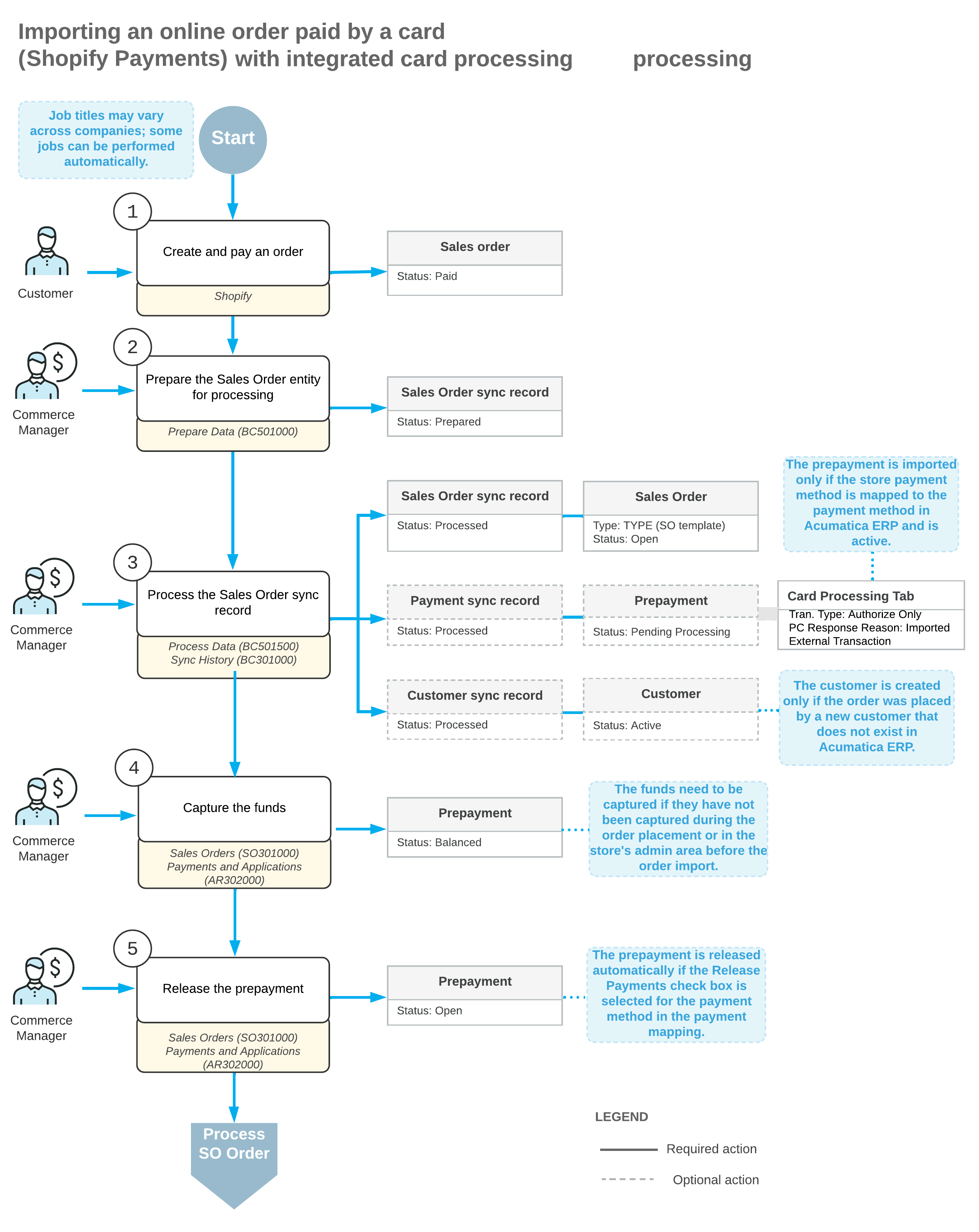 The following diagram illustrates the workflow of importing a sales order to MYOB Acumatica from a Shopify store where it was placed and paid by a card based on a payment method for which integrated card processing has been configured in MYOB Acumatica.