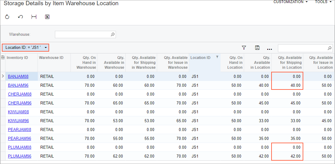 - On the Storage Details by Item Warehouse Location (IN408055) form, review the quantities of stock items available in the RETAIL warehouse.