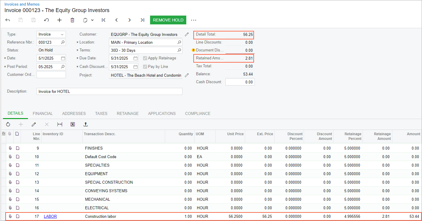 Finally, you will release the related AR invoice with retainage on the Invoices and Memos (AR301000) form