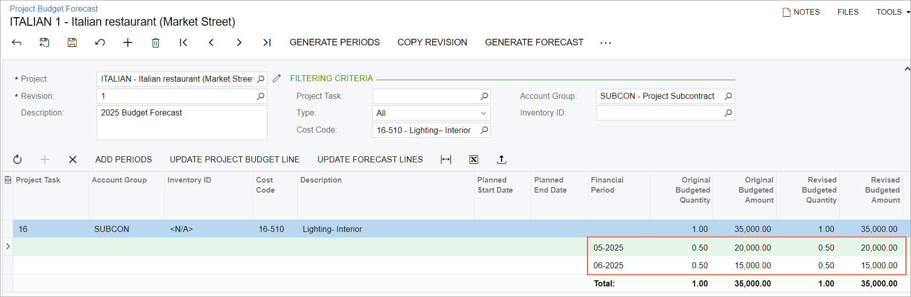 Suppose that the ToadGreen project estimator wants to prepare a budget forecast to be able to compare and analyze monthly budgets versus actual costs broken down by period. Because some work on interior lighting will be performed for the project in May and June of 2025, the project estimator wants to distribute the total lighting budget across the periods when this work is going to be performed. Also suppose that the work performed in June will cost an additional $5,000 that had not been planned in the project budget.