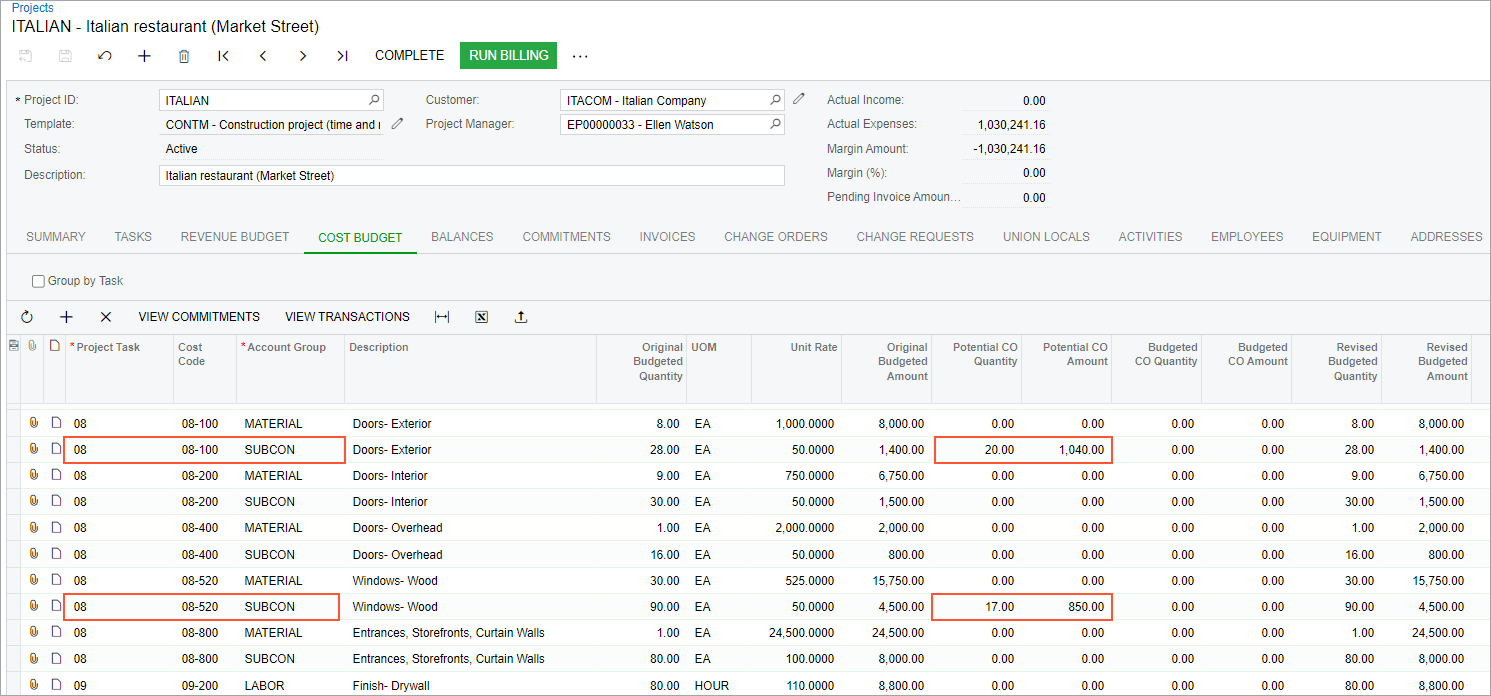 Suppose that ToadGreen Building Group is a general contractor building an Italian restaurant for the Italian Company customer. The ToadGreen project accountant has created a project for the work to be performed and the budget has been agreed upon with the customer. The construction work has been started.