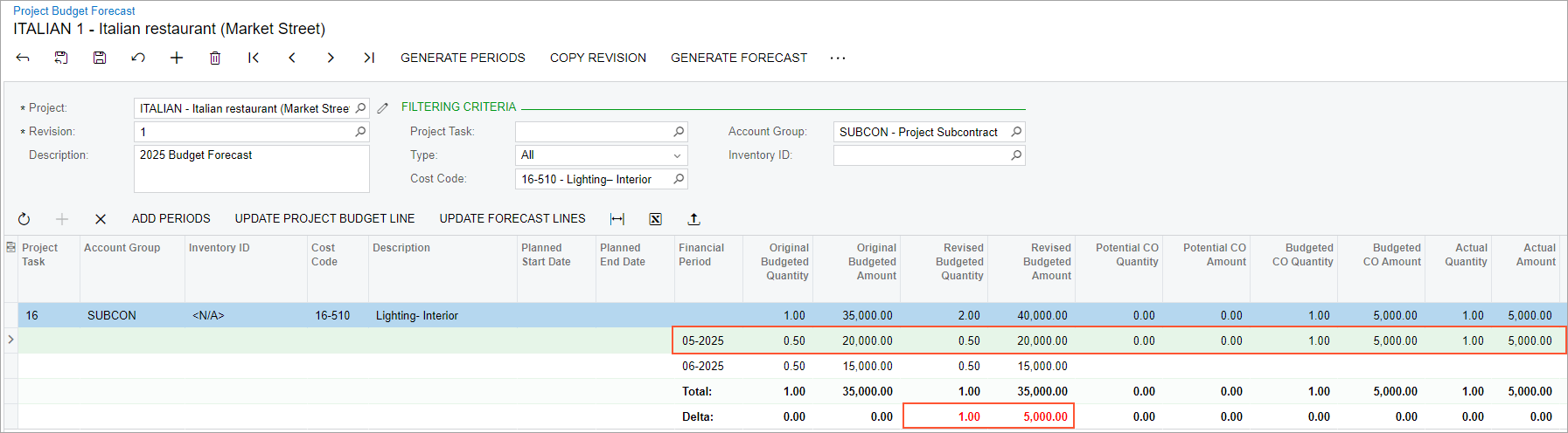 Review the forecast lines, and notice that the system has updated the budgeted and actual amounts for the 05-2025 period, as shown in the following screenshot.