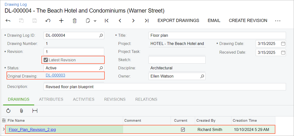 - On the form toolbar of the Drawing Log (PJ303000) form, which opens with the drawing log, click Create Revision.