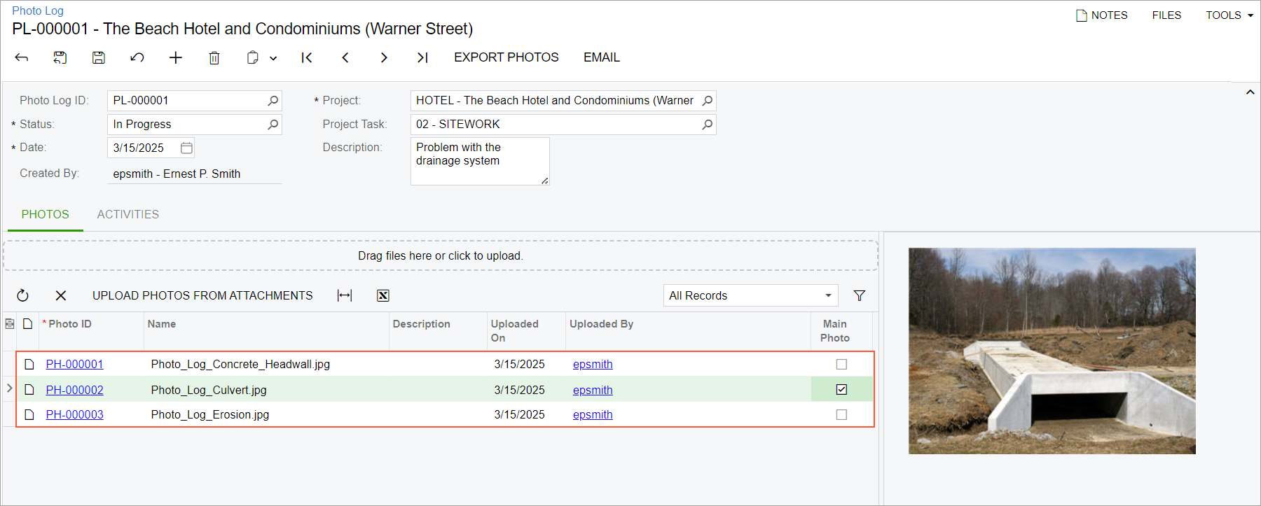 While you are still viewing the photo log that you have created on the Photo Log (PJ305000) form, upload the photos to the photo log by doing the following: