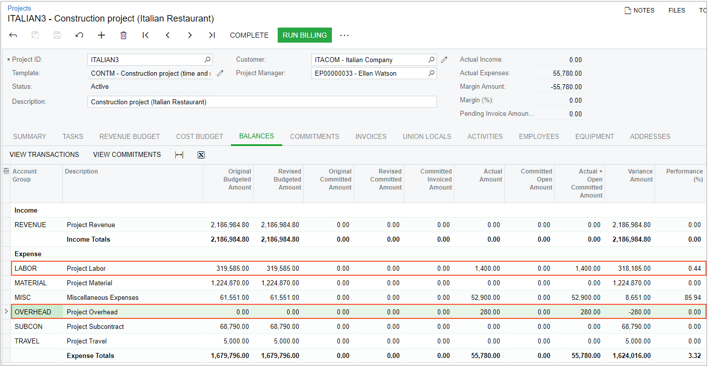 In this activity, you will first specify the allocation rule for the project task on the Projects (PM301000) form. On the same form, you will then perform allocation for the project and review the project balances.