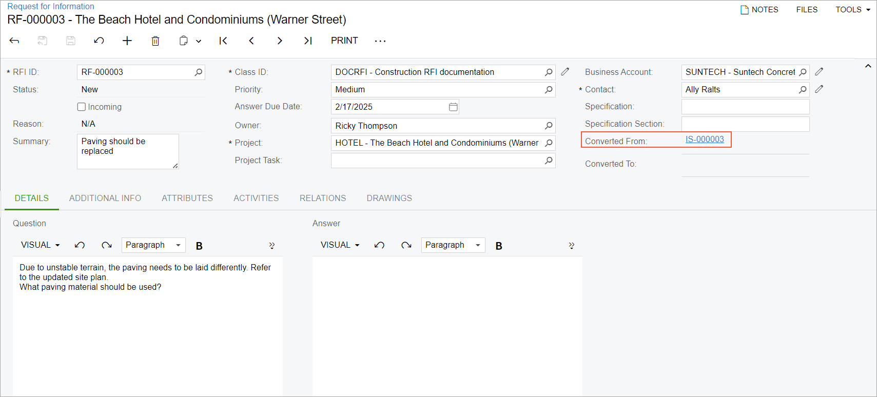 Acting as a construction foreman, you need to enter the project issue in the system, and then you need to clarify which paving material needs to be used by processing a request for information for the project issue.