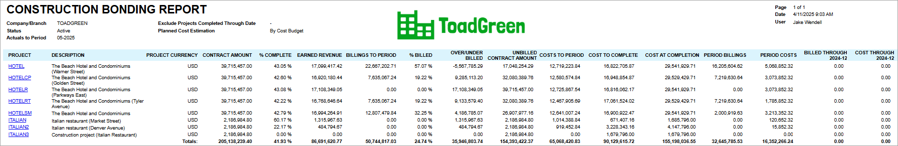 Suppose that to ensure profitability, a project estimator of the ToadGreen company wants to see how projects are progressing in May 2025, and which projects may need special attention.