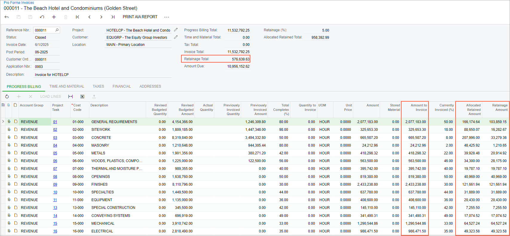 On the Pro Forma Invoices (PM307000) form, which opens with the selected pro forma invoice, review the retainage amounts on the Progress Billing tab. In each line, the retainage amount is calculated as the retainage percentage applied to the amount to invoice; for example, for the line with the 01-000 cost code, Retainage Amount is 103,859.15 (2,077,183.00 * 0.05).