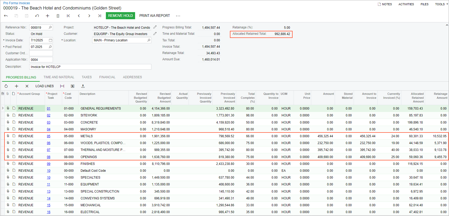 Notice that the Allocated Retained Total equals 992,886.42: This is the maximum retainage amount that can be held for the project. To avoid exceeding the retainage cap, for this invoice, the system has calculated the rest of the retainage that can be held and has reallocated it proportionally between the invoice lines.
