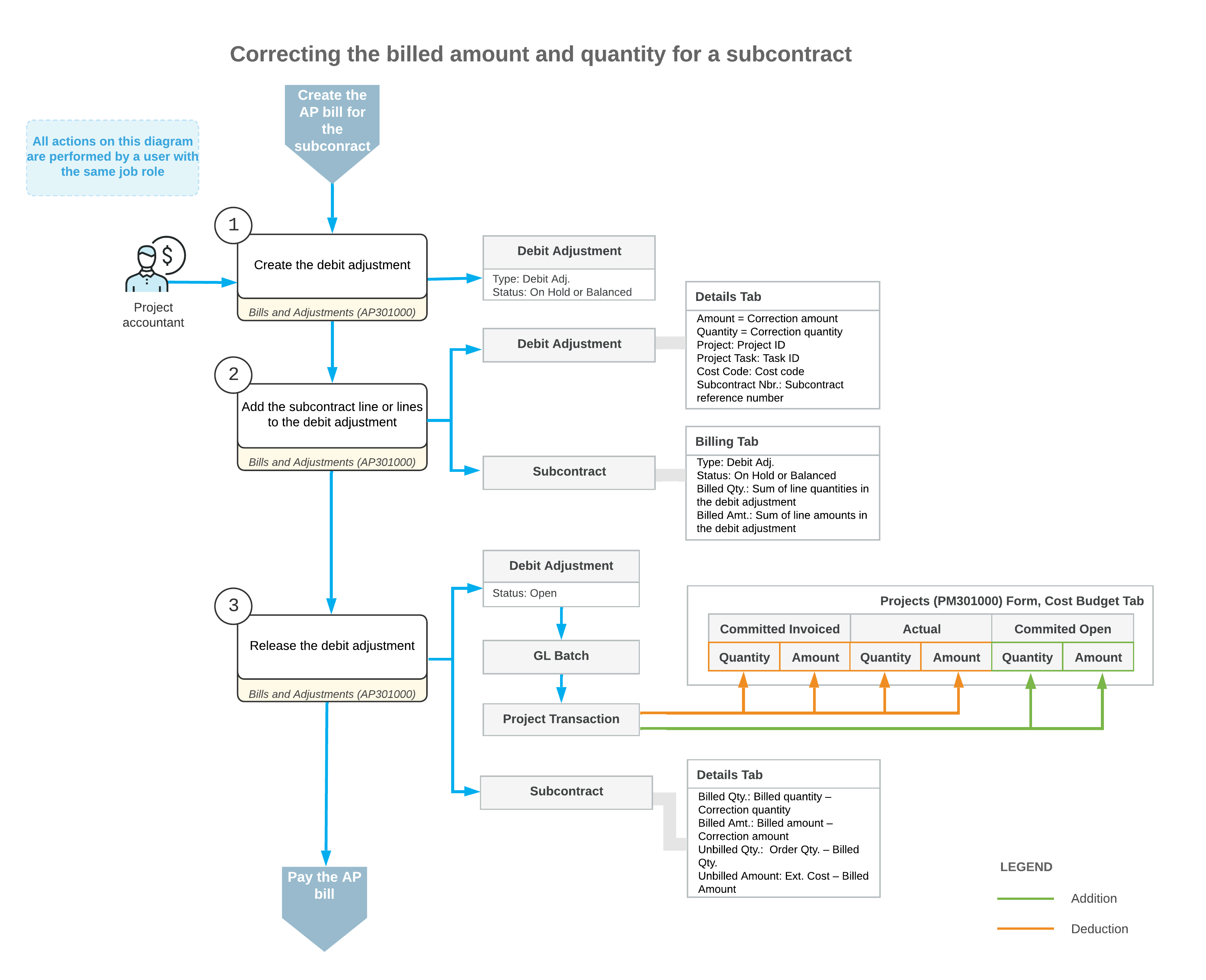 In most cases, a subcontract is considered completed when the services have been provided and the corresponding accounts payable bill has been released to adjust the outstanding balance of the vendor (subcontractor). If the subcontract requires any changes, you may want to correct billed amounts and quantities in the subcontract fully or partially. Because a released accounts payable bill cannot be edited or deleted, to correct the billed amount and billed quantity, you need to process a debit adjustment that decreases the accounts payable balance.