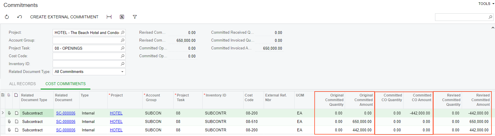 - On the Commitments tab, review the list of subcontracts related to the project. Notice that the subcontract that you have processed now has the Order Total of 650,000.