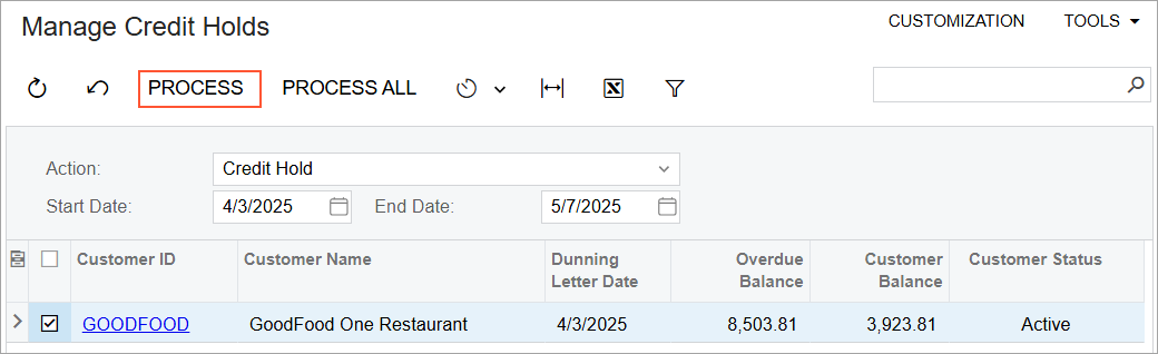 The GOODFOOD customer appears in the table, because with this action selected, the form shows all customers that have the Credit Hold status.