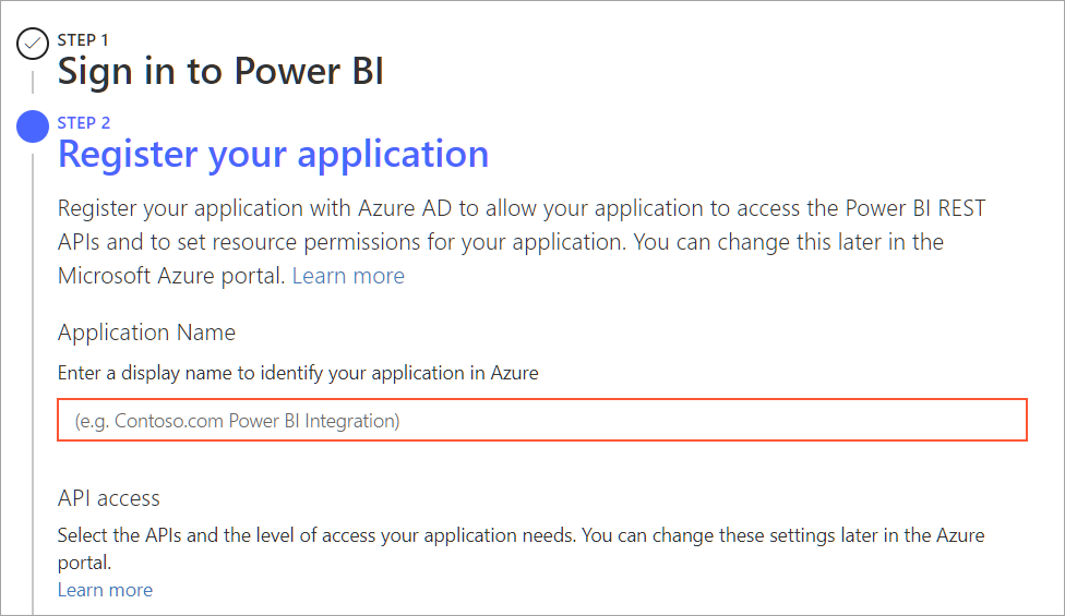 Note: The registration of Power BI embedded is also described in Set up Power BI Embedded.