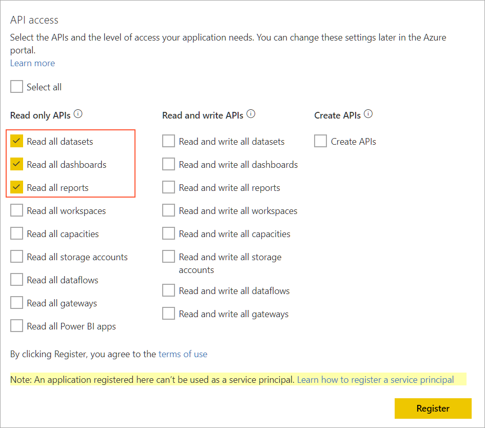 screenshot.Attention: The minimum permissions required are Read all datasets, Read all dashboards, and Read all reports. Other permissions are optional and may be granted for your customers' additional needs and at your company's risk.