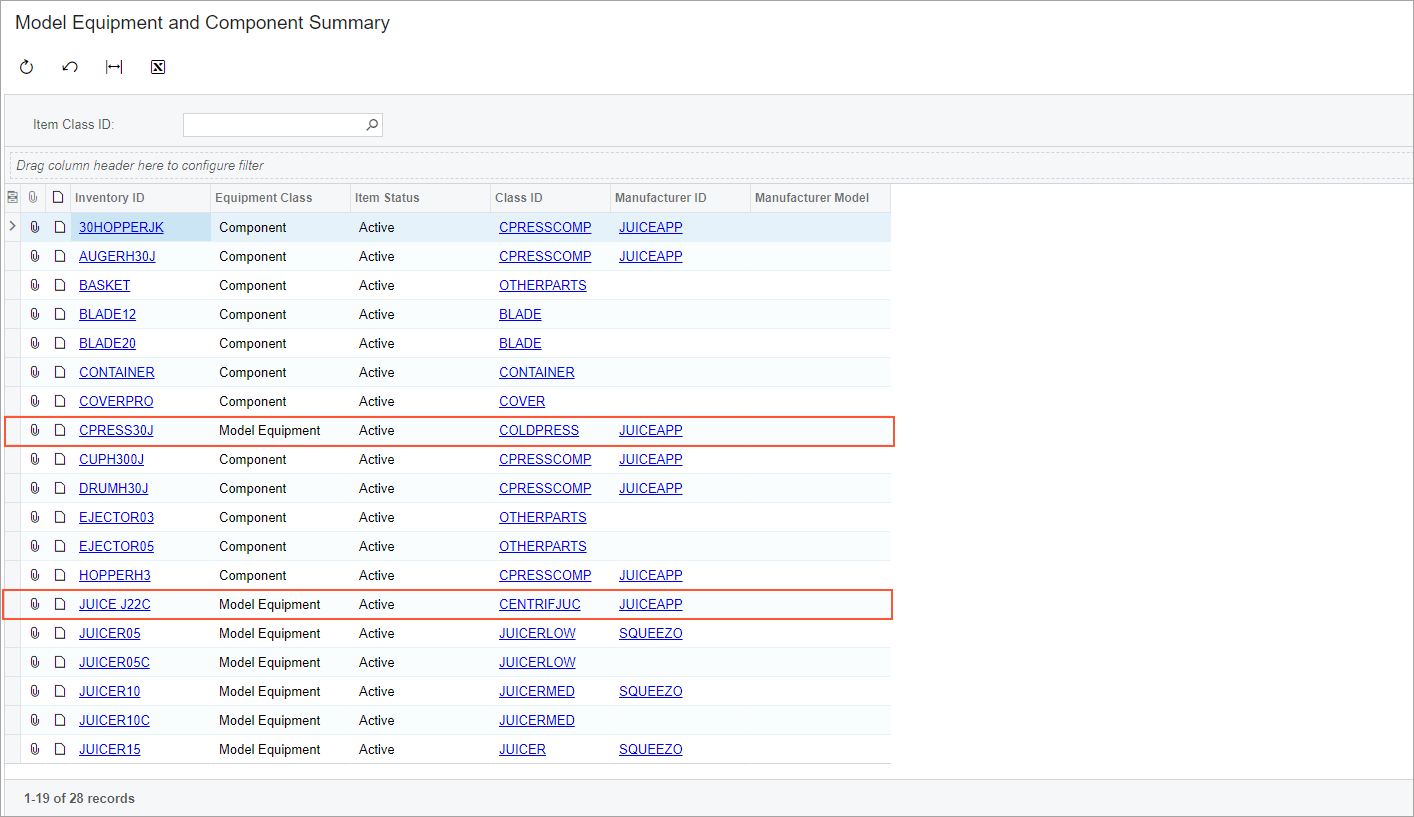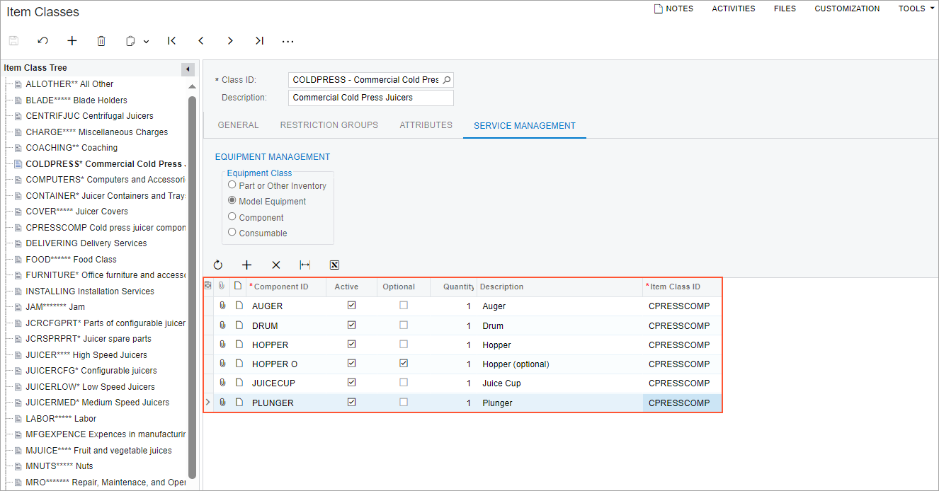 Suppose the SweetLife Service and Equipment Sales Center plans to sell commercial cold press juicers with various components and to track these juicers after they are sold. As the administrative user, you will create the COLDPRESS - Commercial Cold Press Juicers item class for model equipment; this class is specifically designed to manage equipment with components. Next, you will create the CPRESS30J - Cold Press Juicer H30J stock item based on this item class and define the components included with this piece of equipment.