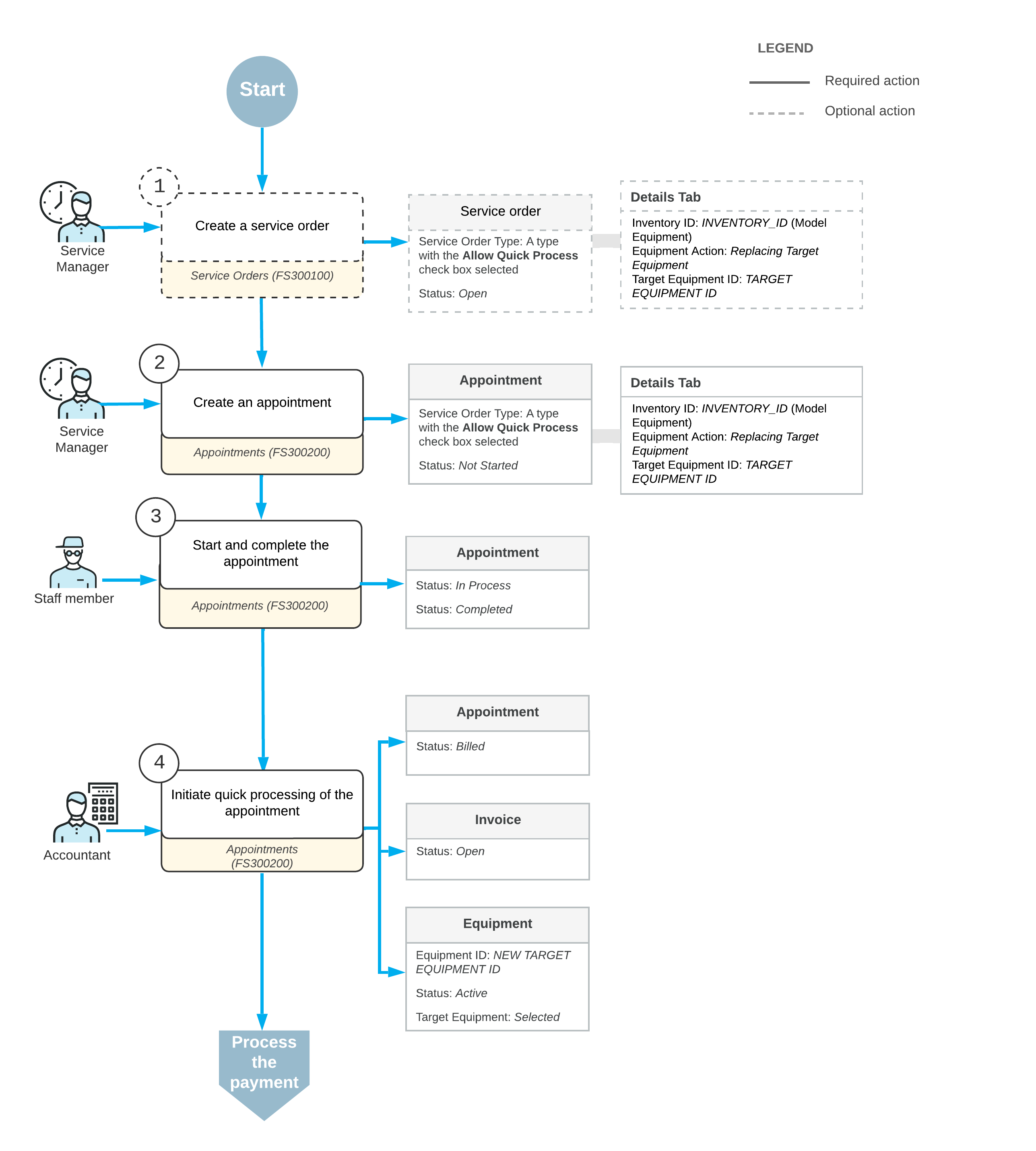 The service manager can instead start by creating an appointment with all these settings; the service order will be created automatically. In Replacing Target Equipment: Process Activity, the appointment will be created first.